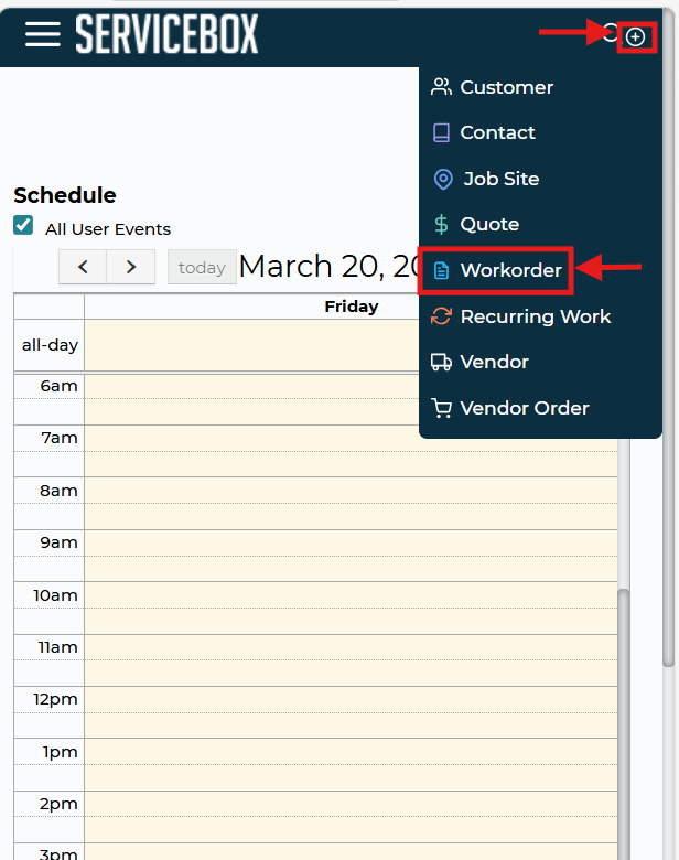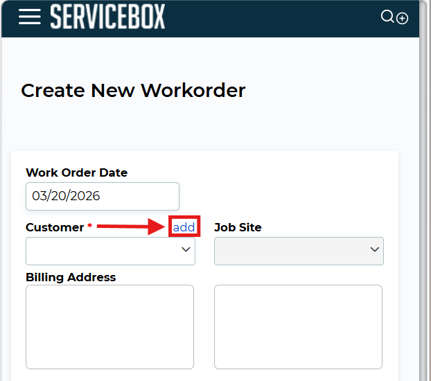 In the top right corner, tap the + icon. This opens a menu where you can create new items like Customers, Job Sites, Work Orders, Quotes, or Recurring Work Orders.