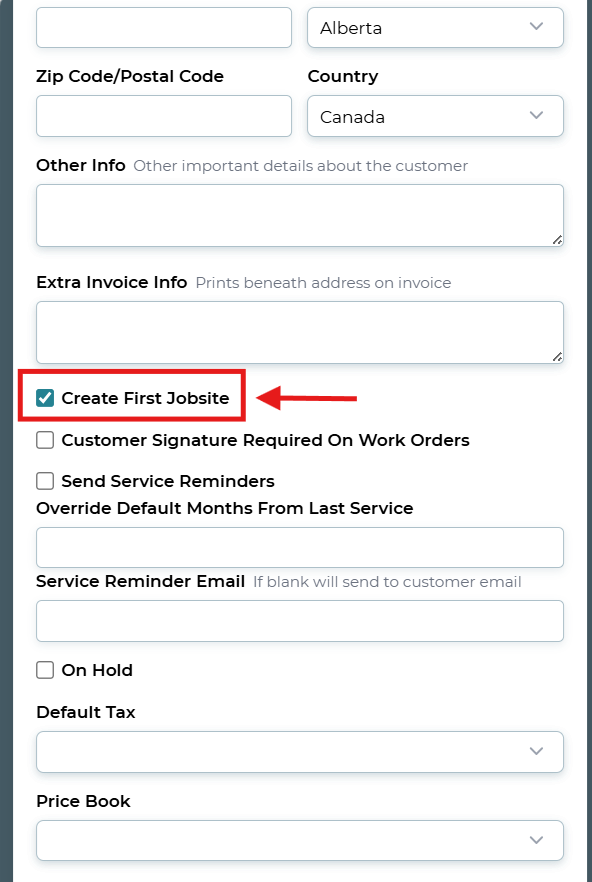 Populate the required fields and enter in an address for the customer. You can choose to create a new job site with the customers address by checking off "Create First Jobsite".