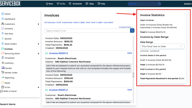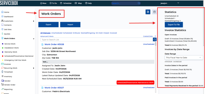 Head to your list of work orders. The right-hand panel displays work order status data followed directly by invoice statistics.