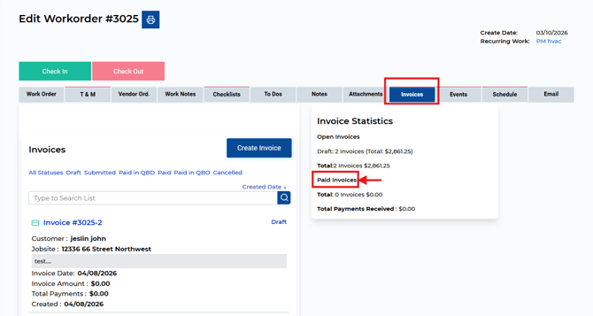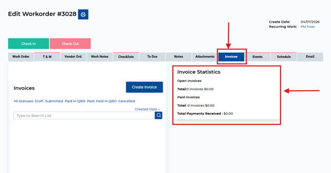 Open an individual work order. Within its invoice list, invoice statistics appear on the right. If the invoice is linked to a quote, the quote statistics will also appear.