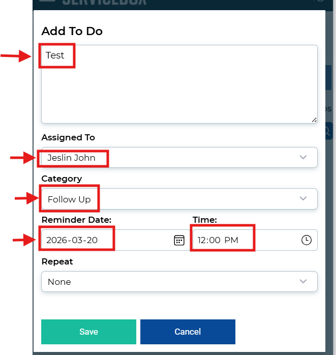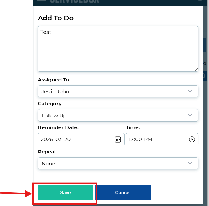 Once all required fields are filled in, click the Save button to add the To Do.