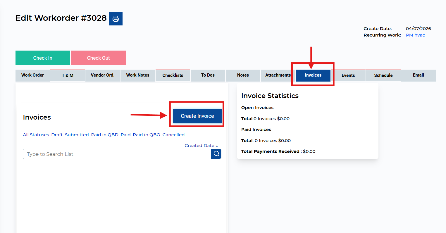 To create an Invoice, you will need to open the Work Order for which you want to create the Invoice. For details on opening Work Orders, see User Guide - Work Orders. Once you are within the Work Order, you can click on the Invoice Tab.
