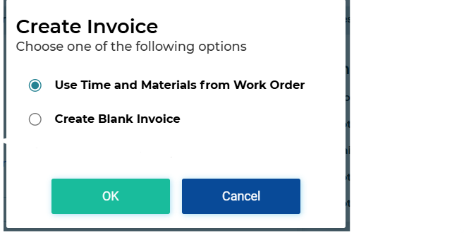Once you click on the Invoice Icon, it will take you to the Invoice section of the Work Order. To create a new Invoice, click on the Create Invoice button and the following pop up will appear.