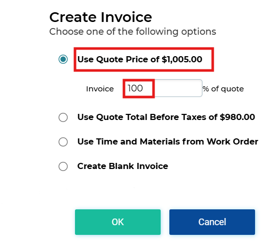 When selected this option allows you to select the percentage of the quote that is to be invoiced. Using this option allows you to create an Invoice for a partial part of the Quote that is often used for Progress Billing. Enter the percentage you will invoice for and Click Ok.