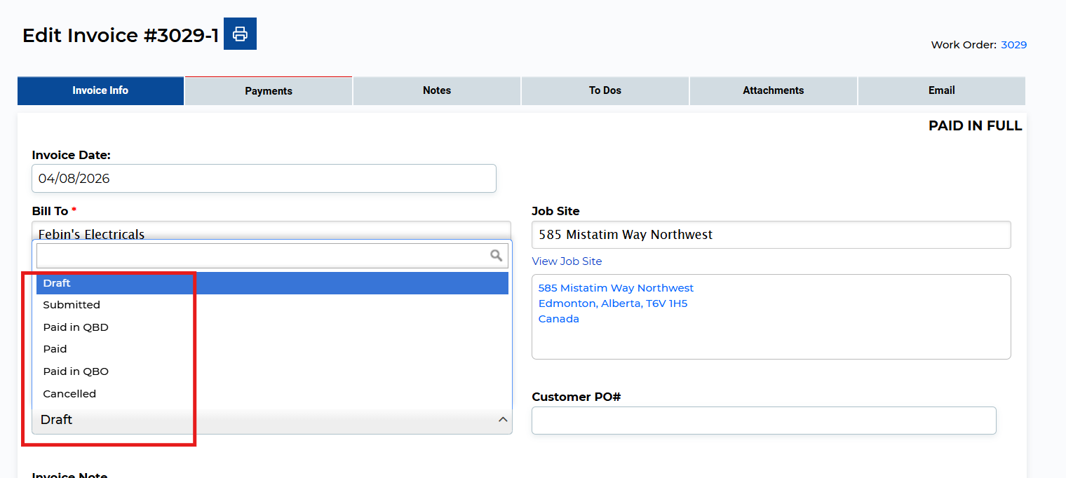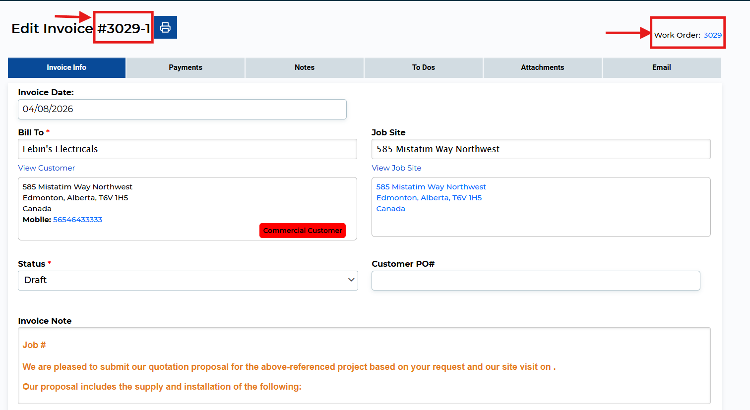 The Customer and Job Site information are taken based on the details in the Work Order. Additional fields may be available depending on how it is configured for your company. You can add in an Invoice Note or other details as needed.