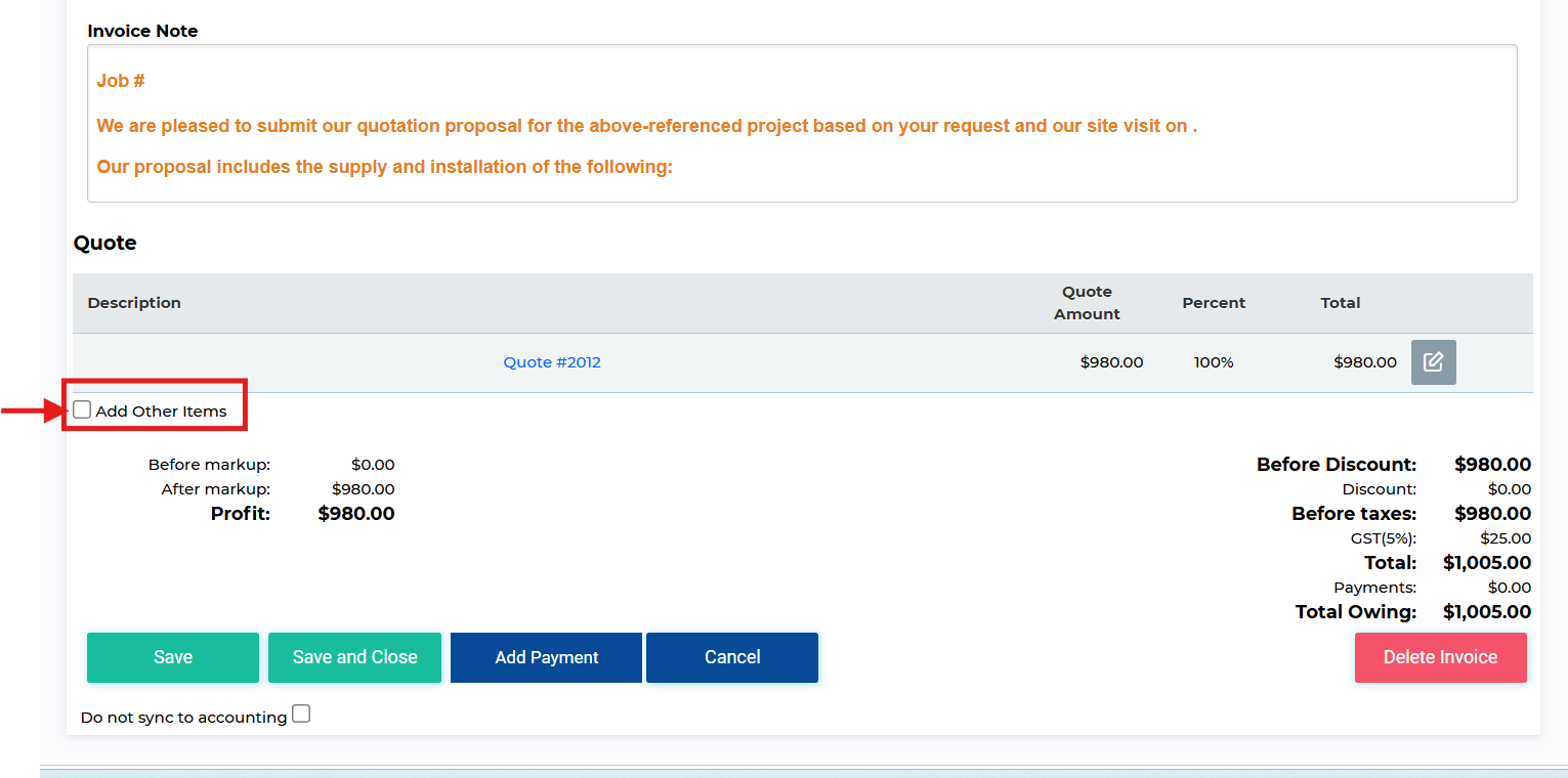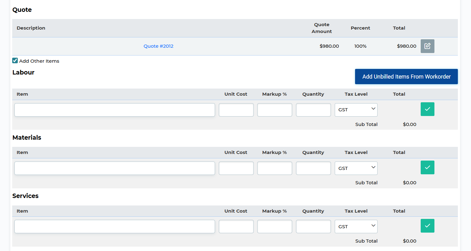 To add additional items that you want to include on the Invoice, select the checkbox for Add Other Items. This will open up additional information on the screen but will be specific to how your company has configured ServiceBox and similar to how you see the details on the Quote Pricing Page.