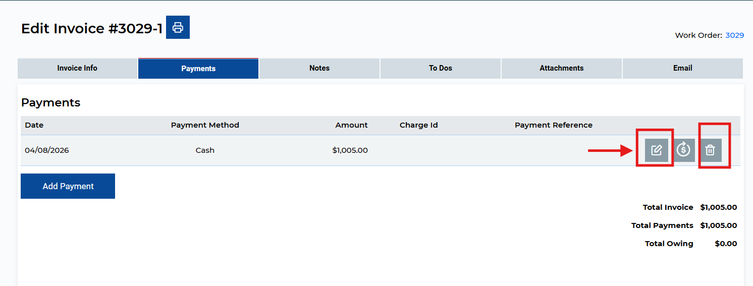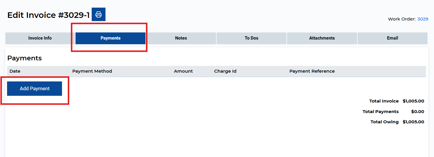 Add Payment within the Invoice Details screen is the same procedure as in the Payments section. Refer to following payments section for how to complete.