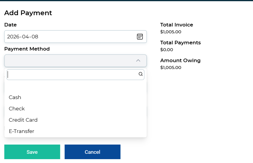 The Payment box will appear and allow details on the specific details of the payment to be entered. Under Method, there is a drop down box that will give the possible options, if an option selected is connected to your Stripe account, you can enter the details as well for the card having the payment applied.