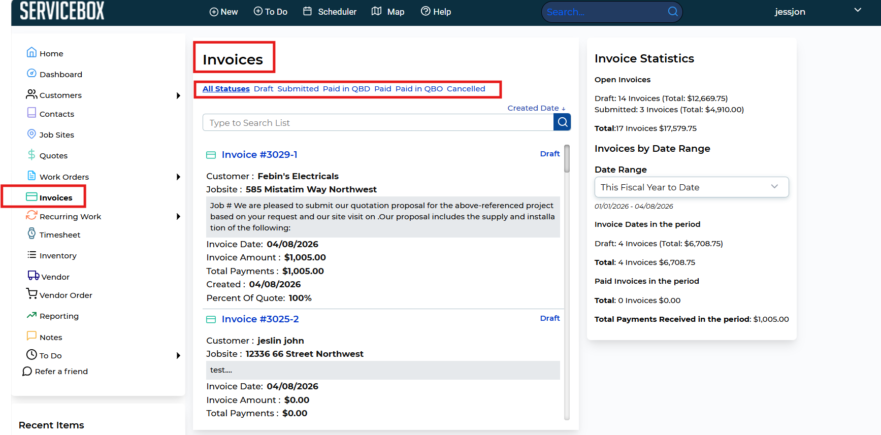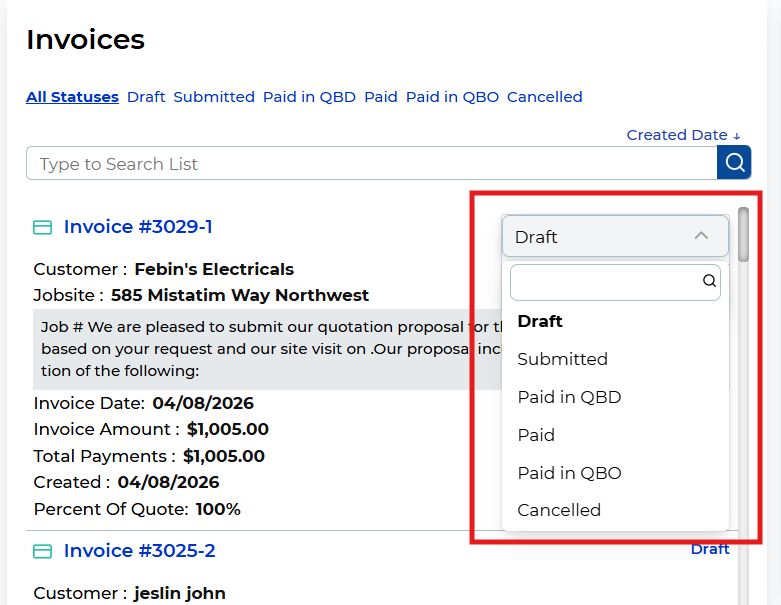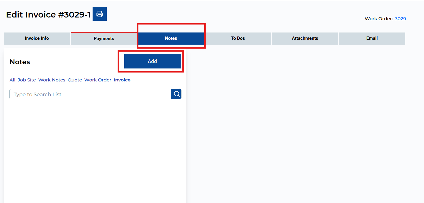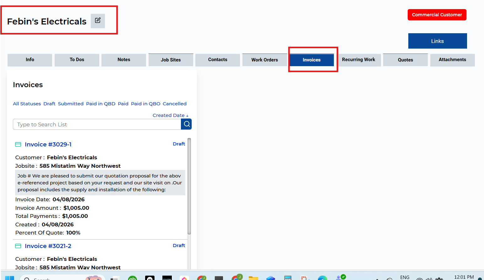 To view Invoices that have been entered, you can see them under the Customer by selecting Invoices. The same can also be done within the Job Site by opening Work Orders and Invoiced.