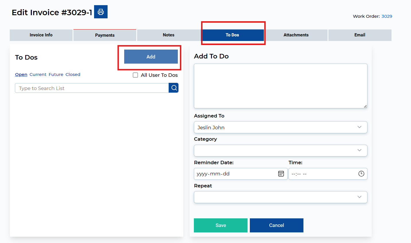 To create a to do, select Add To Do and the information will open up. Enter the details, assign it to the person responsible and select a date for when you want the reminder to be seen.