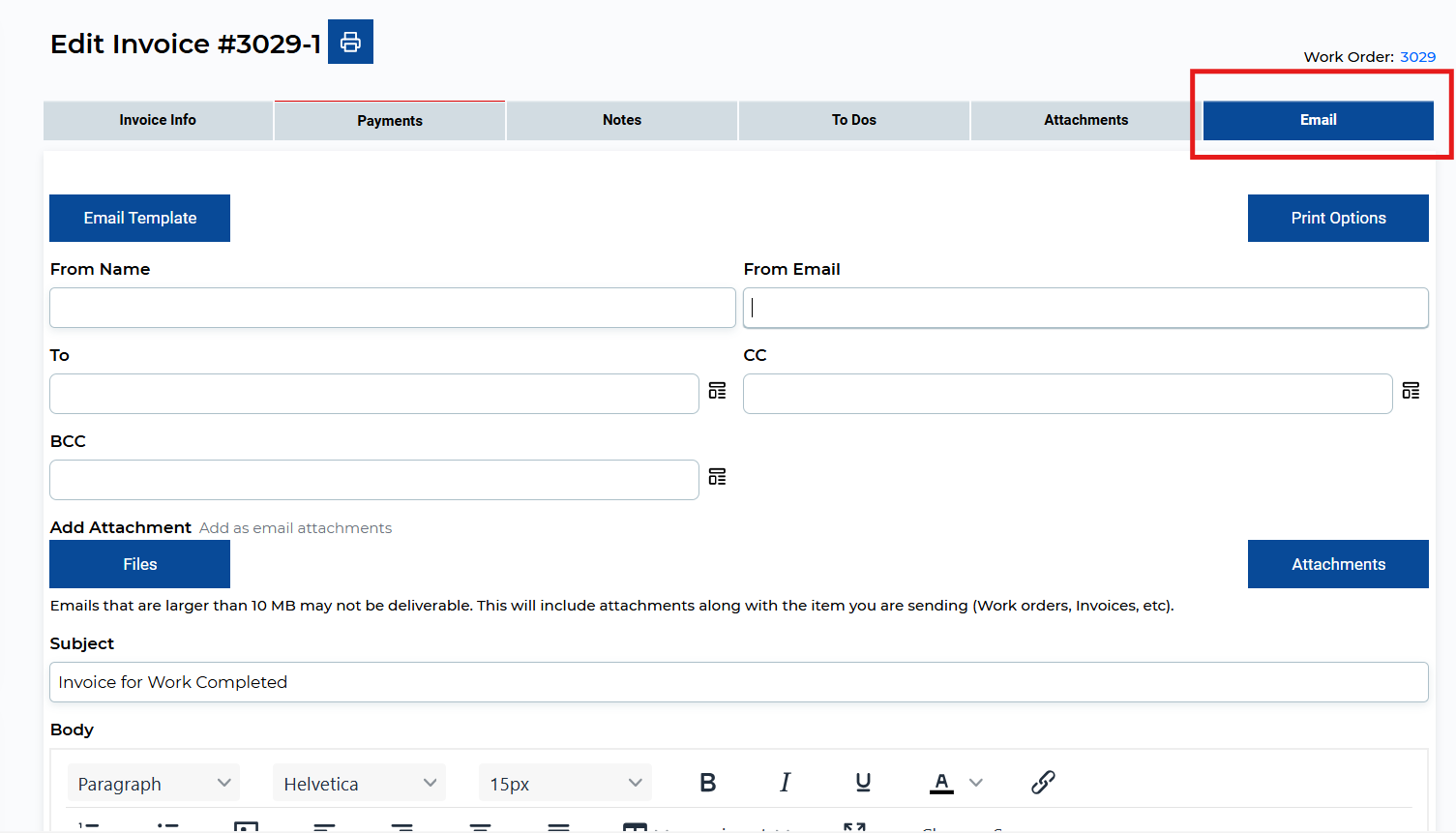 Once the information has been entered you can e-mail the Invoice to the customer right from ServiceBox.