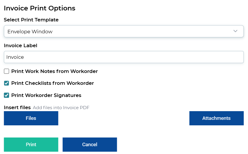 The default options are set in Settings but you can decide to change how you would like to print it. You can select Files or Attachments to view and when Print is selected, the PDF will open in a new tab.