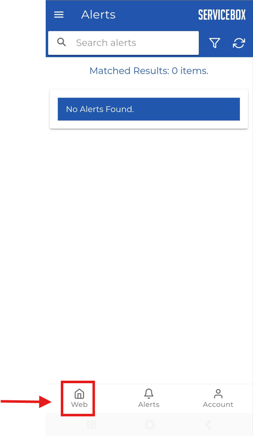 - If you find yourself on the blue "Alert" screen, tap on the "Web" icon at the bottom left and switch to the ServiceBox Dashboard/Screen.