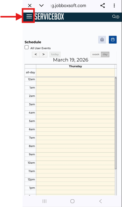 - At the top of the screen, you will see three white lines and the ServiceBox logo